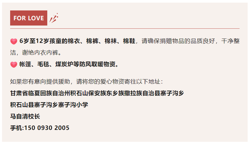 據了解,積石山縣寨子溝鄉寨子溝小學的孩子們正面臨嚴寒和物資匱乏的困境。這些孩子們急需干凈的棉衣、棉褲、棉襪、棉鞋,以及防風取暖物資。