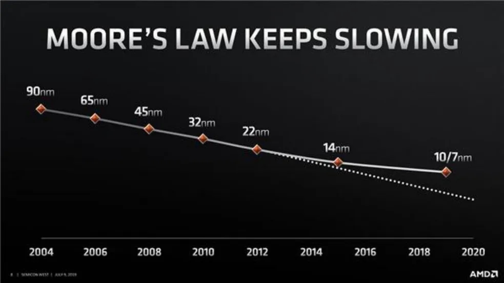 我國目前要攻克的難點,主要集中在“設計”環節。關于芯片設計,有一個很知名的理論——摩爾定律:當價格不變時,集成電路上可容納的元器件的數目,約每隔18-24個月便會增加一倍,性能也將提升一倍。10nm-7nm-5nm-3nm,工藝不斷接近原子極限,靠縮小物理尺寸提高集成度已經愈發艱難,摩爾定律顯著放緩,該如何續寫摩爾定律的傳奇?