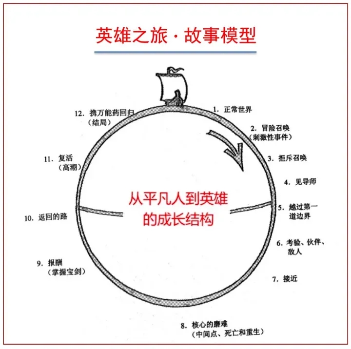 神話學家坎貝爾在神話學專著《千面英雄》中提出了“英雄之旅”的故事模型,并指出主角踏上探險之路,經歷無數的坎坷與挑戰,并在這一過程中完成轉型。