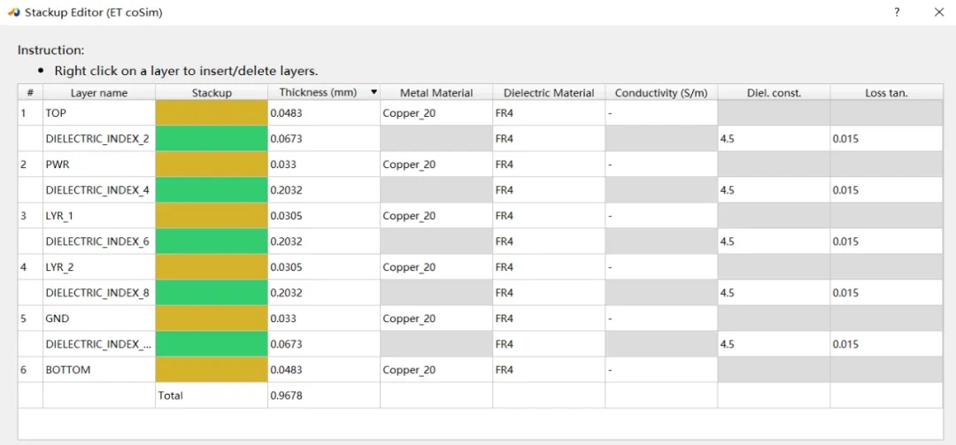 本案例未修改疊層厚度,將所有金屬層和介質層的材料修改為具有電熱屬性的材料,如圖4所示: