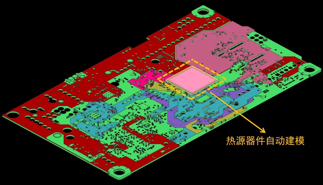 隨著科技的迅速發展,消費類電子產品的功能性需求日漸增強,PCB板載流需求日漸變大,熱管理問題變的尤為突出,局部電流密度過大、板子溫升過高等情況對電子產品的穩定性和功能性影響頗大,輕則元器件效率降低,重則板子完全失效。為了提前規避這類設計問題,在設計初期通過直流電熱仿真軟件對PCB進行仿真模擬無疑是最佳選擇,可以快速、高效、低成本的分析PCB正?;驑O限運作狀態下的電、熱特性,從而進一步優化PCB板的設計,提高其散熱性能,減少熱點問題。由于板子的設計日漸趨向精益、復雜、效率化,僅考慮由于板子運行的功耗帶來的焦耳熱已經不能滿足設計的需求,某些核心的元器件比如CPU、GPU、PMIC等本身的功耗也不可小覷,因此需要額外在電熱協同仿真案例模型中加入熱源器件的概念,將元器件自身的功耗參與仿真計算,在焦耳熱的基礎上考慮元器件自發熱的情況,使仿真案例無限接近實際模型,幫助工程師對元器件進行合理的布局,并設計相應的散熱結構,選擇最優的散熱解決方案,以確保PCB板在長時間高負載工作下能夠保持穩定的工作溫度,避免在生產階段出現問題需要重新設計或更換零部件,從而節約調整成本和時間,提高電子產品的安全性、功能性以及市場競爭力。