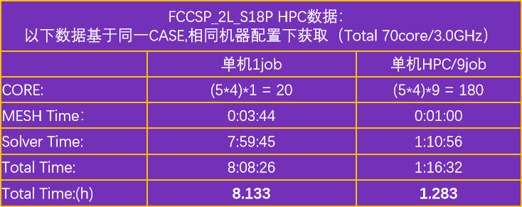 本圖表展示了在相同案例(CASE)、配置和資源條件下,普通模式與多機高性能計算(HPC)模式的效率對比。需要注意的是,HPC模式的并行效率受到數據傳輸時間、服務器響應延遲、內核間運算差異以及不同機器間運算效率不一致等多種因素的影響,因此其效率無法實現100%: 在單個任務僅20core的資源下,普通模式需耗時8.13小時; 而多機HPC拆分成了9個子任務,單個子任務20core,總資源占用為180core,耗時僅為1.28小時 即:多機HPC效率相比普通模式效率可提升約6.3倍;(多機HPC可以調用更多機器的資源用于加速仿真求解)